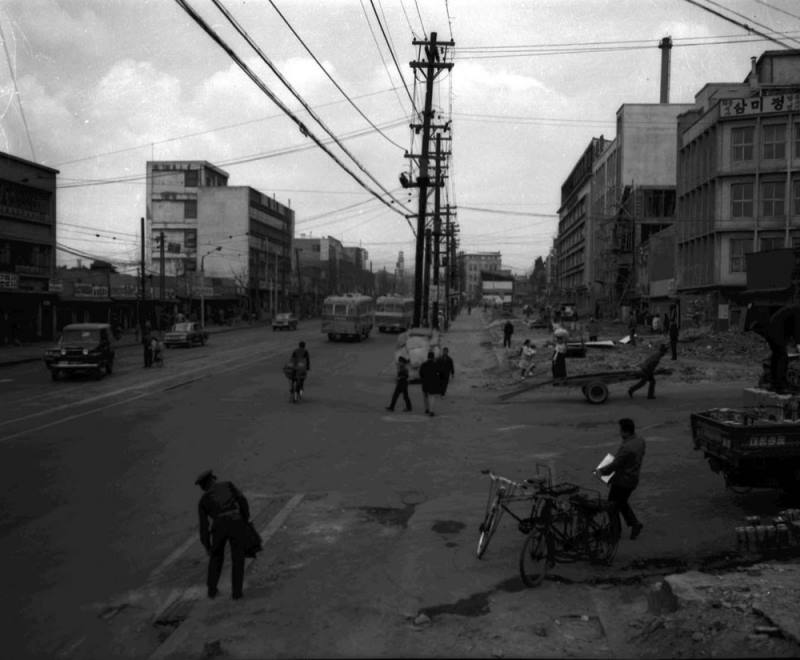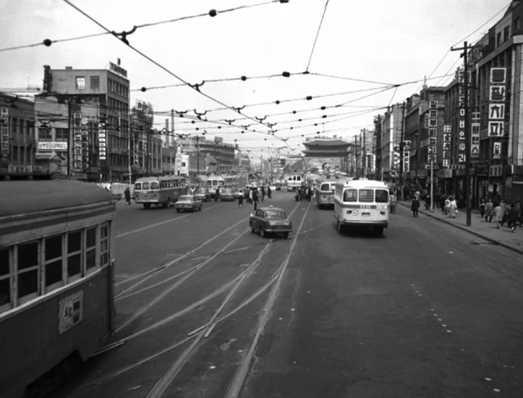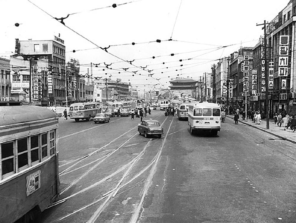1968년 3월 서울 중구 남대문로. 노면에는 전차 선로가 설치돼 있고, 공중에는 전차선이 거미줄처럼 엮여 있다. 당시 노면전차(路面電車)는 마포, 영등포, 왕십리 등 서울의 동서남북으로 노선이 연결돼 있었다.