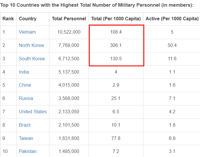 인구 1천명당 군사력, 군인 숫자를 보면 북한은 306명, 한국은 130명, 타이완 78명, 베트남 108명, 중국은 3명, 러시아 25명, 미국 약 7명 정도이다.