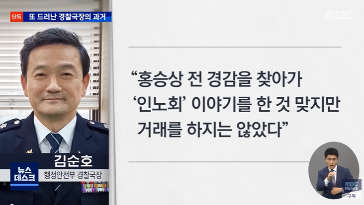 김 국장은 MBC와의 통화에서, "홍승상 전 경감을 찾아가 '인노회' 이야기를 한 건 맞지만 거래를 하지는 않았다. 거래를 했으면 더 높은 직위를 요구했을 것"이라고 밝혔습니다.
