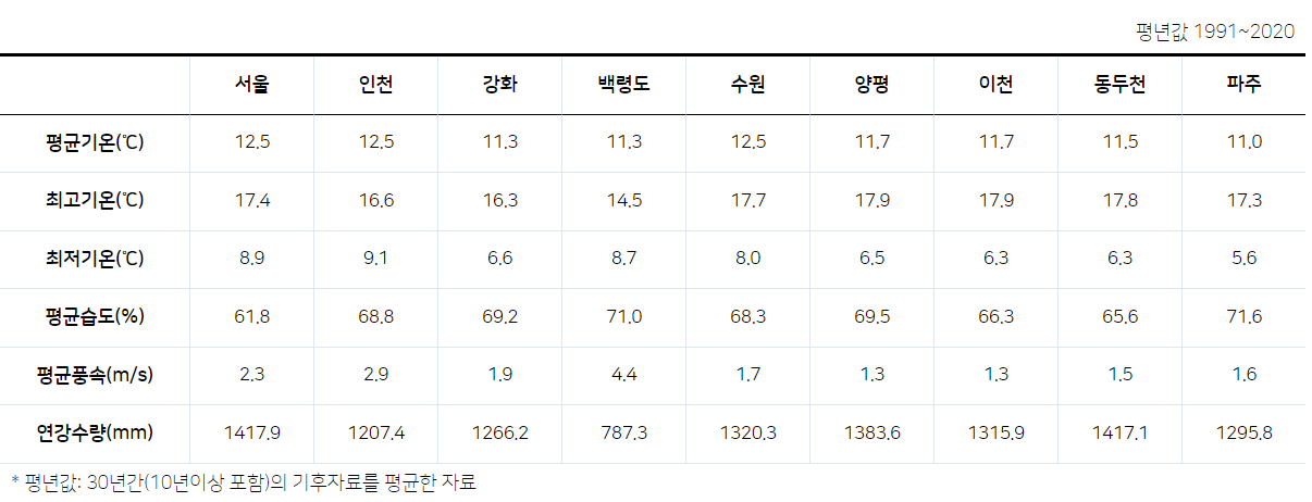 인천(1207), 수원(1320), 강화(1266), 양평(1384), 이천(1316), 동두천(1417), 파주(1296) 연간 평균 강수량.