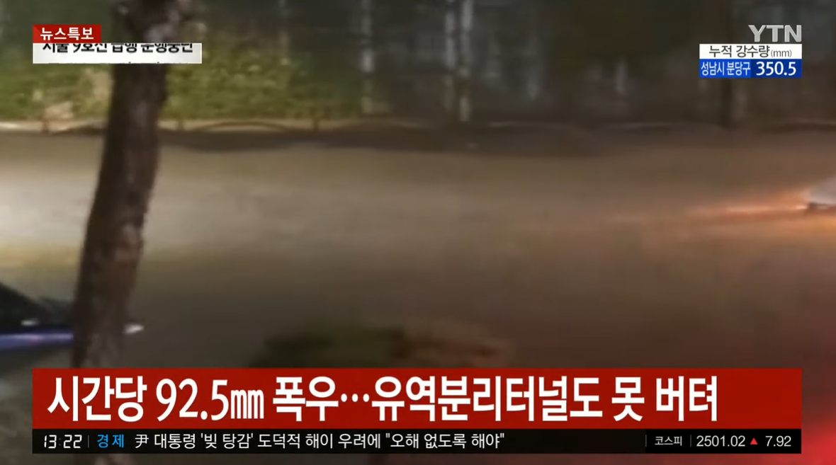 8일부터 중부지방에 쏟아진 기록적인 폭우로 서울 강남구와 서초구, 동작구, 관악구 일대가 또다시 물에 잠겼다. 이 구간의 지하철 운행이 중단돼 출퇴근길 시민들이 불편을 겪었고, 인명피해까