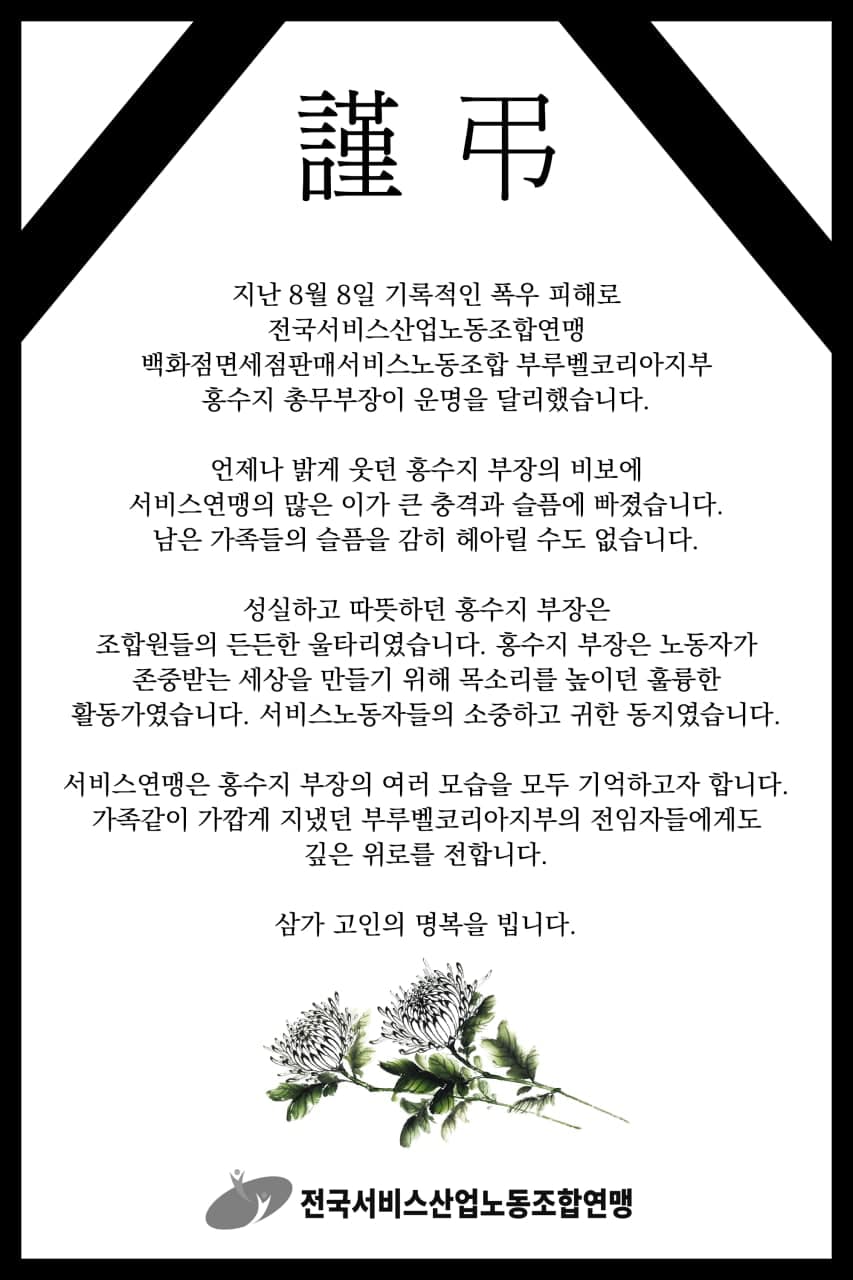 대한민국 모든 여성노동자의 안녕과 홍수지동지와 가족의 명복을 빕니다.