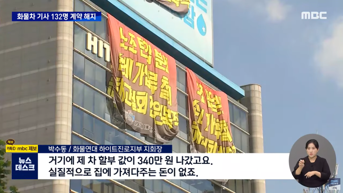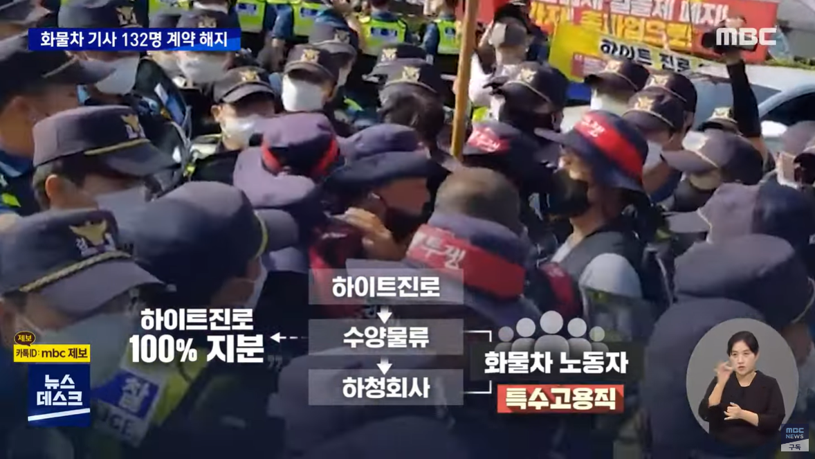 하이트진로는 운송료 인상을 요구하는 백서른두 명의 화물차 기사의 계약을 해지하고, 협상을 거부하고 있습니다.