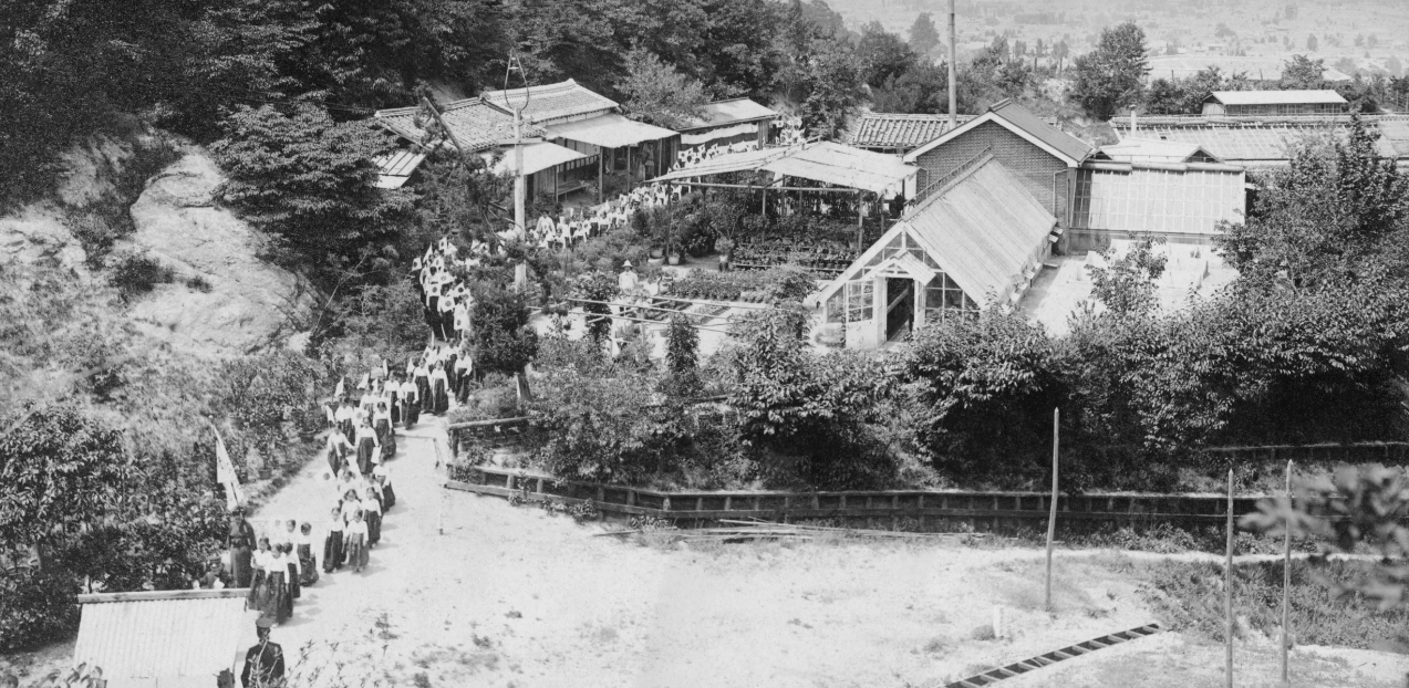 일제강점기 초기인 1912년 5월 25일에 찍힌 사진입니다. 기모노를 입은 여성들이 교복을 입은 어린 학생들에게 일장기를 나눠주고 있습니다. 이곳은 어디이고, 저 학생들은 누구일까요?