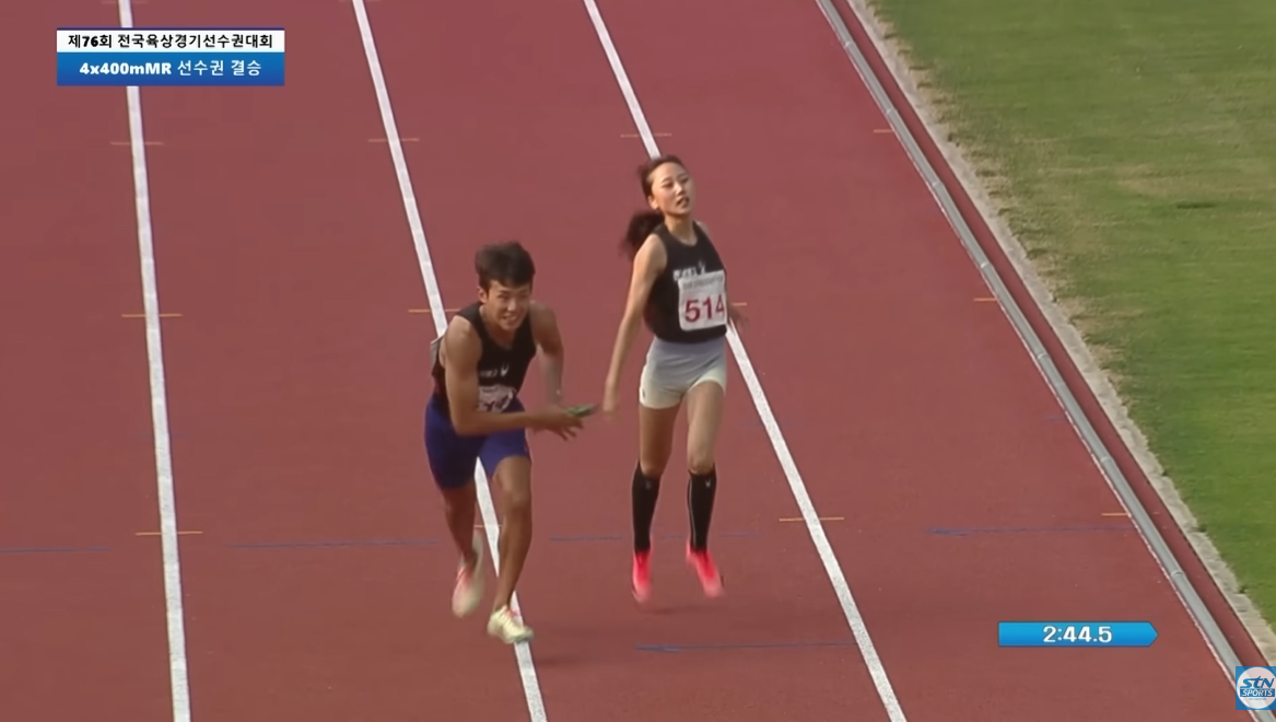 세번째 주자 양예빈이 네번째 마지막 주자 배건율에게 바톤을 터치하는 순간.