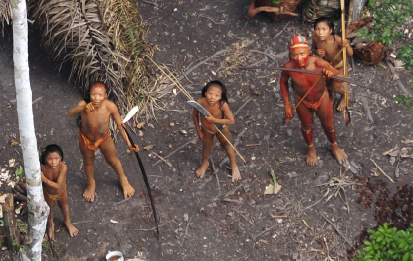 Uncontacted people in Brazil seen from the air during a Brazilian government expedition in 2010. Men painted with red and black vegetable dye watch the Brazilian government plane.