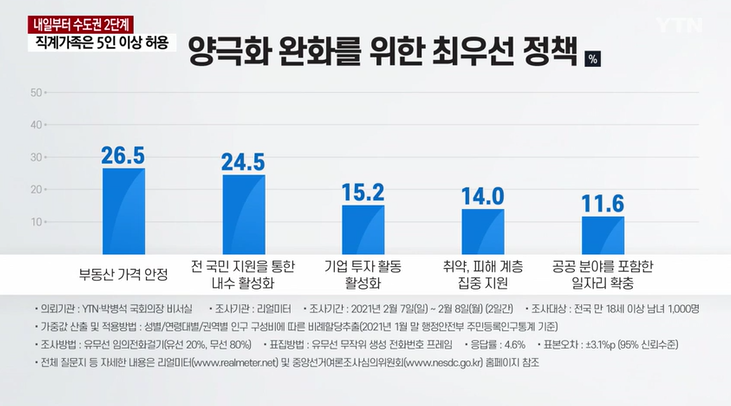 3. 양극화 해소책으로는 1) 부동산 가격 안정 2) 전 국민 지원을 통한 내수 활성화 3) 기업 투자 활성화 4) 취약 피해 계층 집중 지원 5) 공공 분야 포함 일자리 확충
