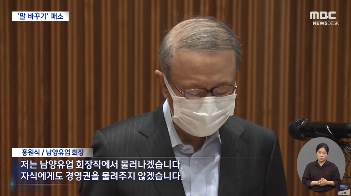 "저는 남양유업 회장직에서 물러나겠습니다. 자식에게도 경영권을 물려주지 않겠습니다."