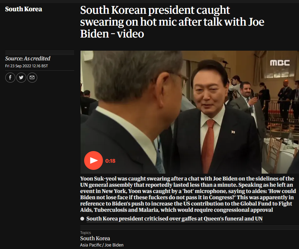 Yoon Suk-yeol was caught swearing after a chat with Joe Biden on the sidelines of the UN general assembly that reportedly lasted less than a minute. Speaking as he left an event in New York, Yoon was caught by a 'hot' microphone, saying to aides: