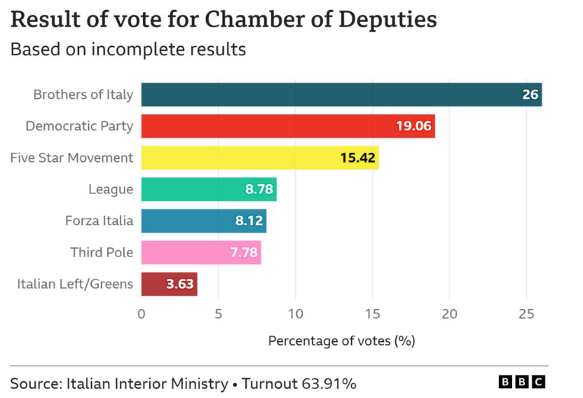 2022년 총선에서 마리오 드라기의 전국 대연정 정부로부터 분리한 후, '이탈리아 형제당'은 26%를 득표함.