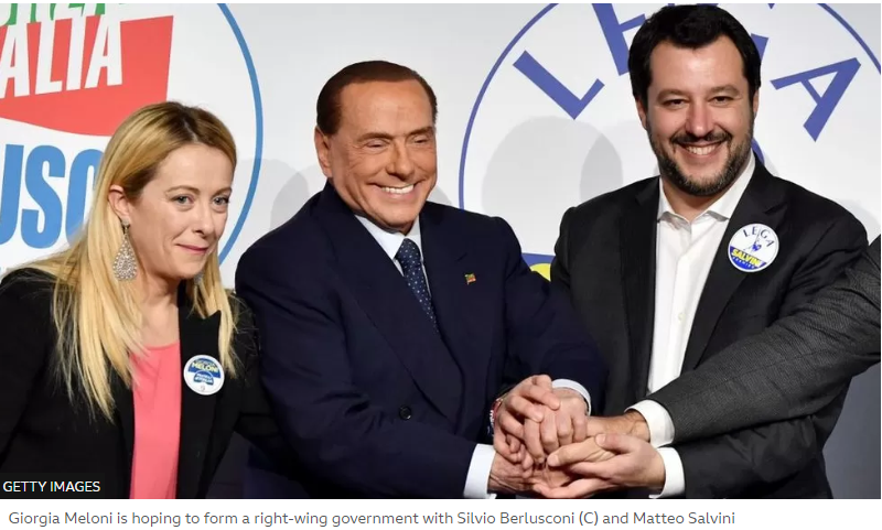 조지아 멜로니 우파 동맹자들. 마테오 살비니 극우 리그, 실비오 베루스코니 중도우파 포자 이탈리아. ( Matteo Salvini's far-right League and former PM Silvio Berlusconi's centre-right Forza Italia )