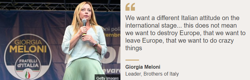 Italy is a founding father of the European Union and a member of Nato, and Ms Meloni's rhetoric on the EU places her close to Hungary's nationalist leader Viktor Orban.