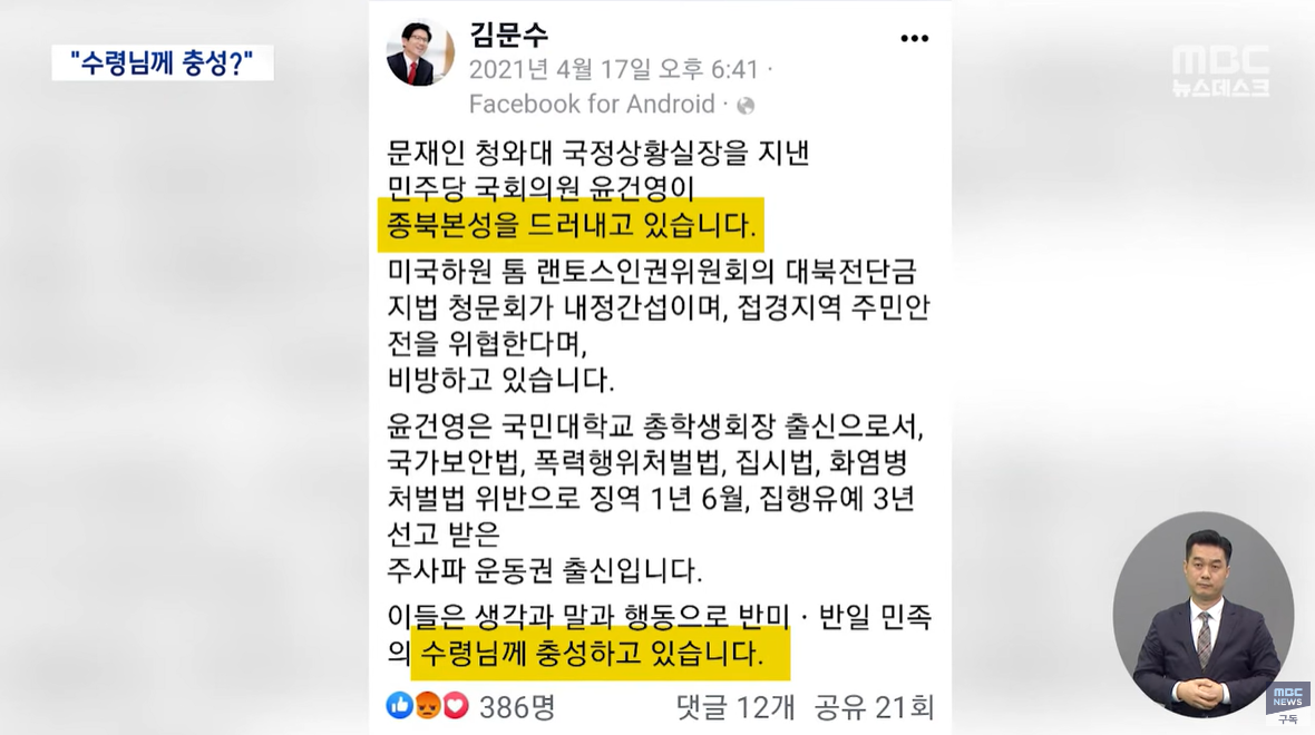 특히 민주당 윤건영 의원에 대해 종북본성을 드러내고 있다, 수령님께 충성하고 있다고 쓴 데 대해선 당사자인 윤 의원이 직접 해명을 요구하고 나섰습니다.