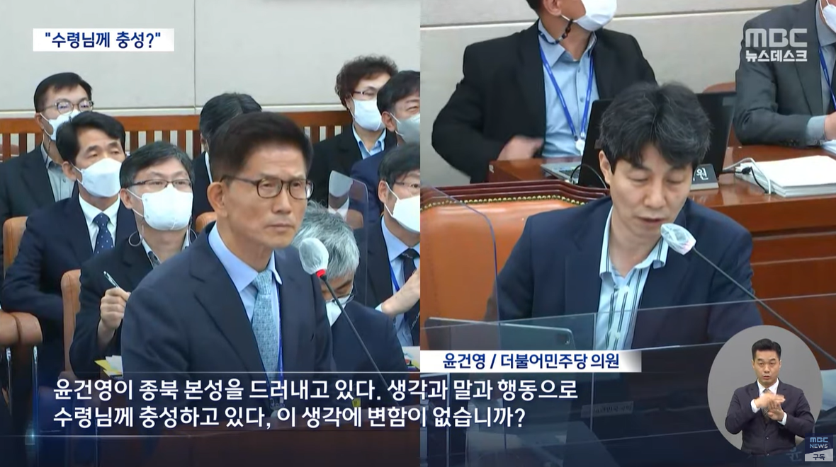 "윤건영이 종북 본성을 드러내고 있다. 생각과 말과 행동으로 수령님께 충성하고 있다, 이 생각에 변함이 없습니까?"