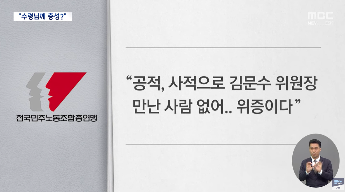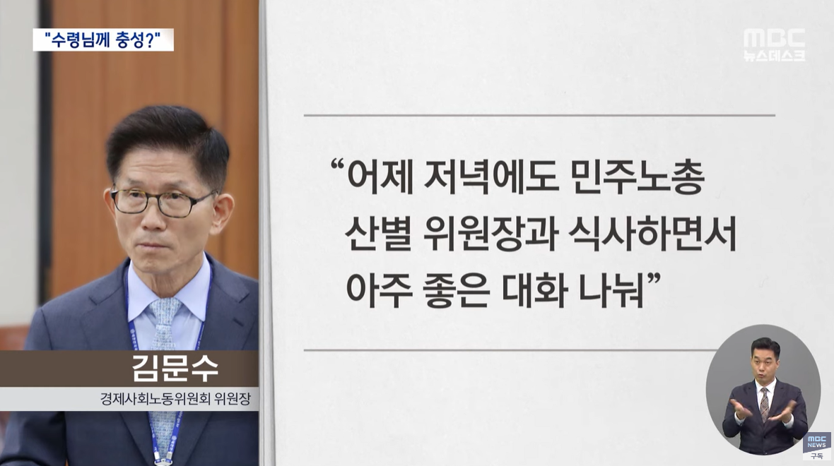 김 위원장은 또 경사노위에 불참하고 있는 민주노총을 설득할 방안이 있냐는 질문에 민주노총 산별 위원장과 어제저녁 식사를 함께했다며 자신감을 보였는데, 민주노총은 공적, 사적으로 김 위원장을 만난 사람이 없다, 위증이라고 반박하면서 진실공방이 벌어지기도 했습니다.
