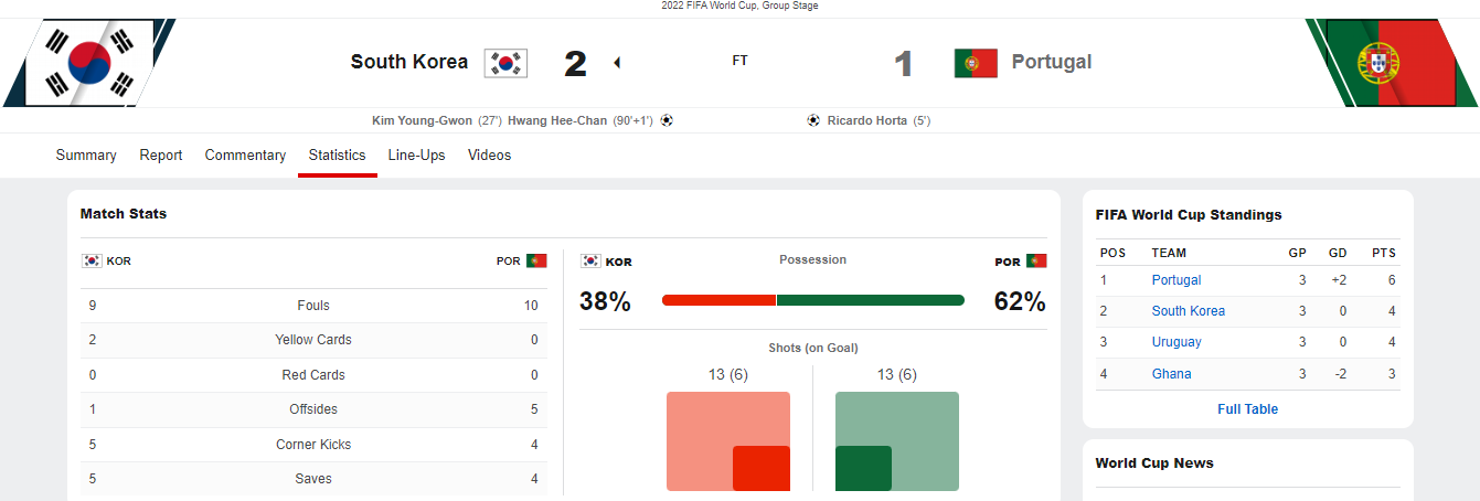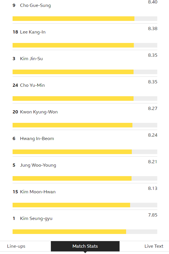 | BBC 월드컵 보도. 우루과이 전 한국 선수 평점.손흥민 7.88, 김승규 7.46, 김문화 7.34, 김진수 7.29, 김민재 7.23, 김영권 7.22, 황인범 7.04 (0) | 2022.11.26 |