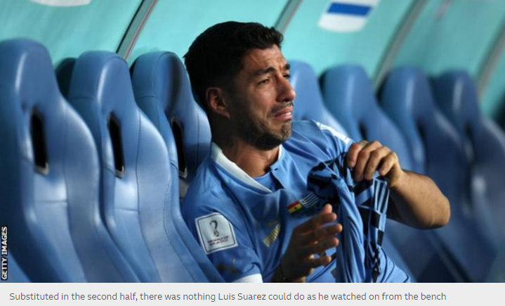 Seven minutes were added on and, as news filtered through of South Korea's victory over Portugal, an image flashed up of Suarez sitting on the bench in disbelief.