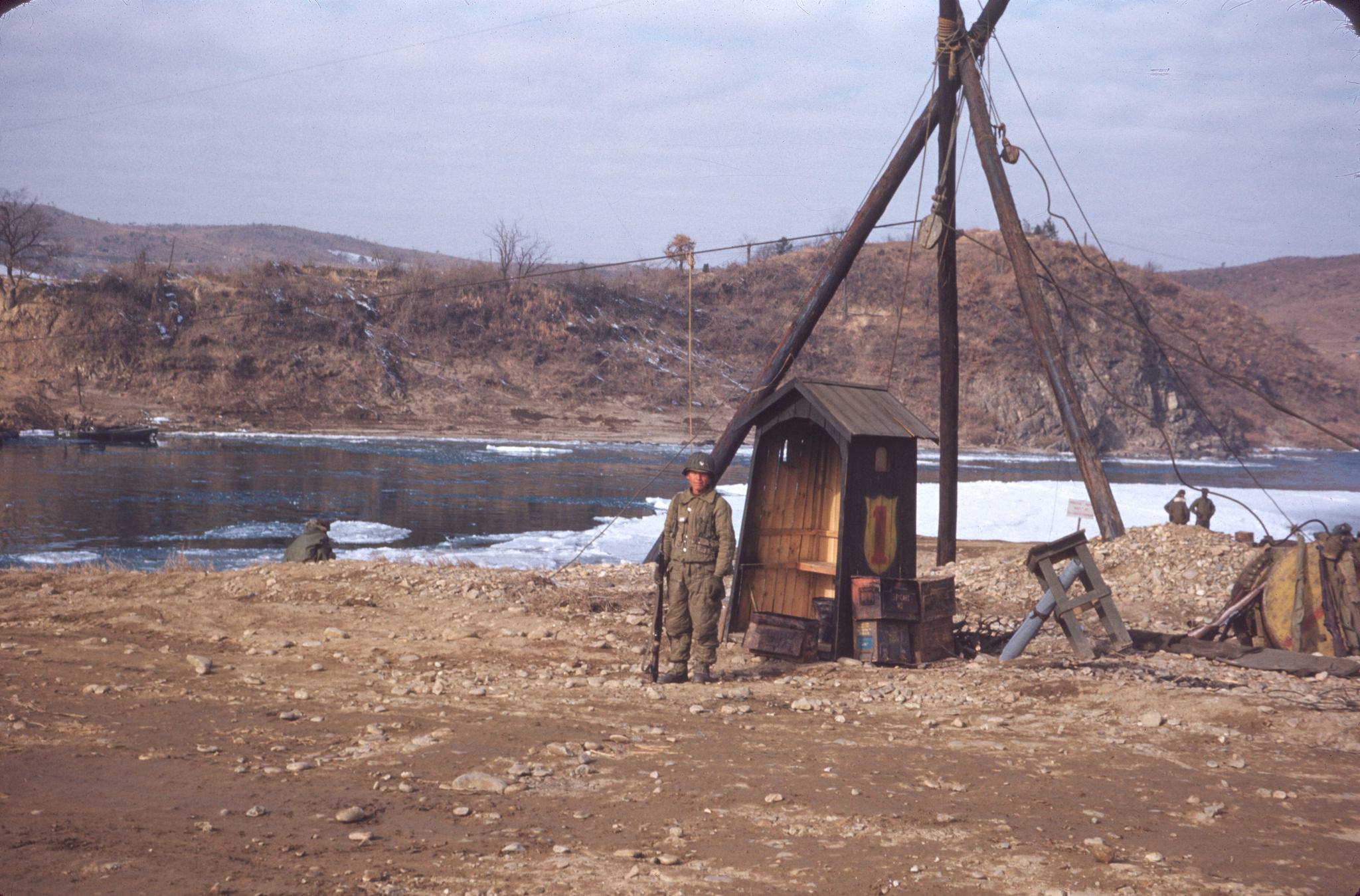 A company of the 9th Engineer Battalion, X Corps, construct a pontoon bridge over the Han River at the crossing point, seven miles south of Chunju, Korea