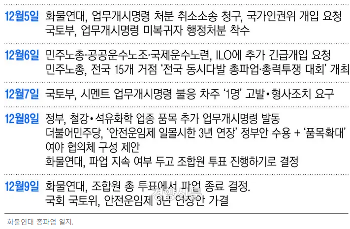 ⑩ 12월9일 : 화물연대 투표끝 현장 복귀…여 “안전운임 원점 재검토” 강경론