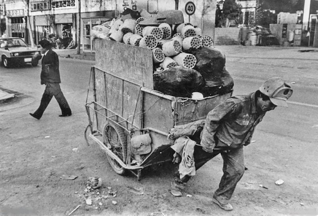 연탄재를 실어 나르는 청소부 사진. 1980년대까지만 해도 한국 도시, 읍내에서 흔히 볼 수 있었던 광경이었다.