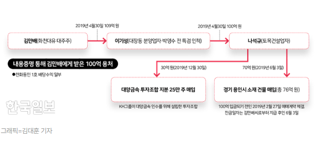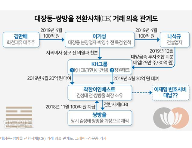 한국일보가 확보한 '대장동 일당 금전거래 내역'에서도 쌍방울의 흔적을 확인할 수 있다. 김만배씨는 2019년 4월 박영수 전 특별검사 인척인 대장동 분양업자 이기성씨에게 100억 원을 입금했고, 이씨는 같은 날 토목업체 대표 나석규씨에게 100억 원을 입금했다. 나씨는 2019년 12월 KH그룹이 대양금속 인수를 위해 설립한 투자조합 지분 25만 주를 30억 원에 매입했는데, KH그룹은 김성태 전 회장 소유의 신생법인인 착한이인베스트와 50억 원의 금전거래를 하는 등 밀접한 관련이 있다.