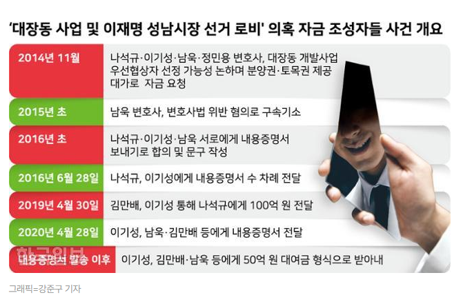 15일 한국일보 보도에 따르면, 서울중앙지검 대장동 수사팀은 위례·대장동 사업 분양대행업체 대표인 이기성 씨와 토목업자 나석규 씨 등을 조사하는 과정에서 김만배 씨로부터 나 씨에게 건너간 100억 원의 용처를 파악했다.