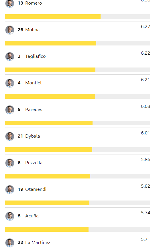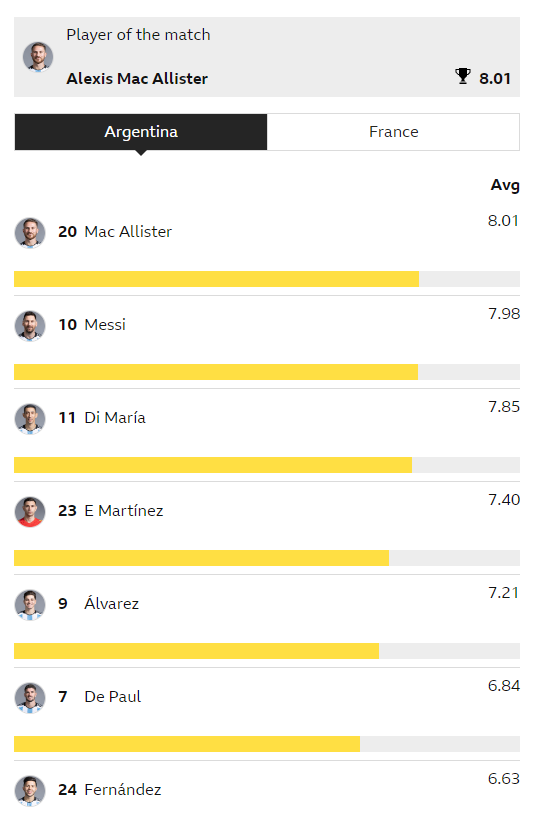1.아르헨티나 미드필더들이 특히 전반에는 프랑스 공격을 무력화시켰다. 알렉시스 알리스터 등 미드필더와 윙어 디 마리오가 메시와 협업을 잘 했다.