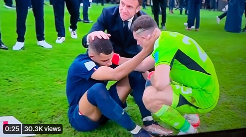 경기 후, 결승전 3골을 넣고도 패배한 음바페가 운동장에 주저앉아 있자, 프랑스 대통령 마크롱이 그를 위로해주는 사이, 아르헨티나 골키퍼 마르티네즈가 음바페에게 위로의 말을 건네며 일으켜주고 있다.