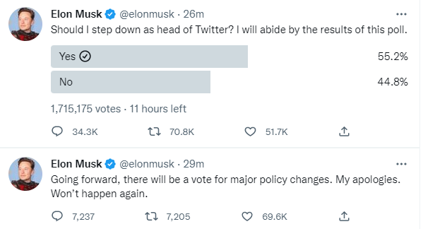 Elon Musk, "Should I step down as head of Twitter? I will abide by the results of this poll"
