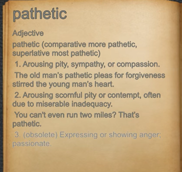 Pathetic 퍼쎄틱. 1) 동정심을 불러일으키는, 혹은 ‘경멸적인, 깔보는’ 동정심을 유발시키는.