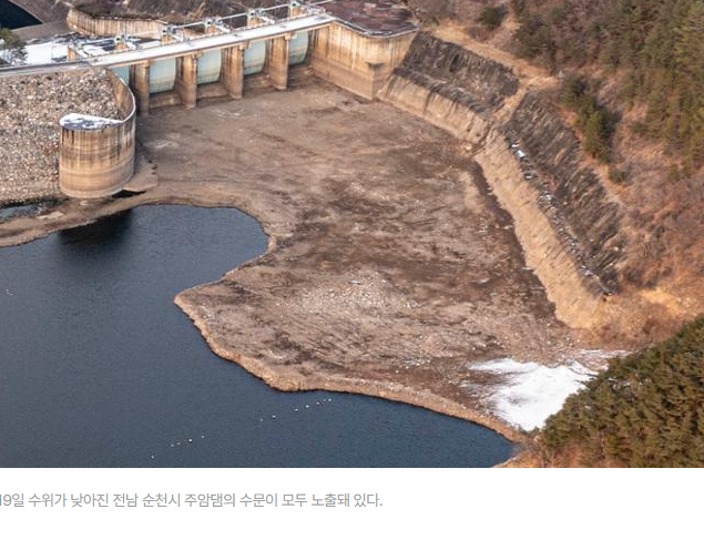 주요 수원지의 저수율은 평년 대비 절반 수준으로, 한반도 기후 특성상 가장 저수율이 낮은 시기인 장마 직전 시기 저수율보다도 낮다. 19일 전남의 주요 수원지인 순천시 주암호의 수위가 낮아져 드러난 비탈면에 하얀 눈이 흙 주름을 따라 쌓여 있다.