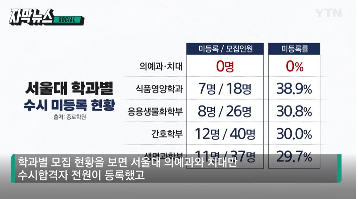 학과별 모집 현황을 보면 서울대 의예과와 치대만 수시합격자 전원이 등록했고 식품영양학과, 응용생물화학부, 간호학부 생명과학부 등은 등록 포기가 30~40%에 달했습니다.