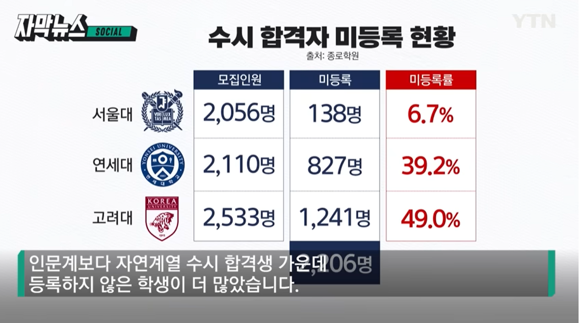 연세대는 40% 고려대는 무려 절반 가까이 등록을 포기했는데, 인문계보다 자연계열 수시 합격생 가운데 등록하지 않은 학생이 더 많았습니다.