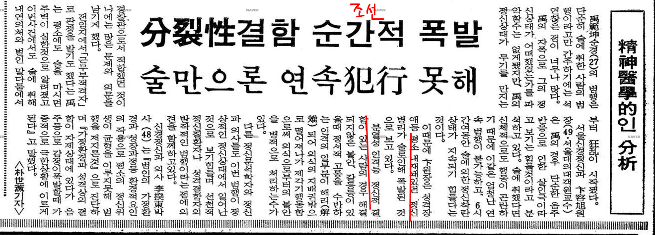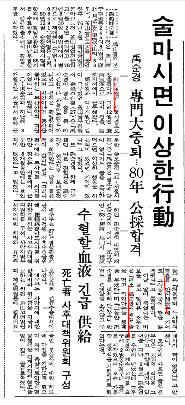 4월 28일자 동아일보. 전말순 , 우범곤의 동거녀 병상 인터뷰.