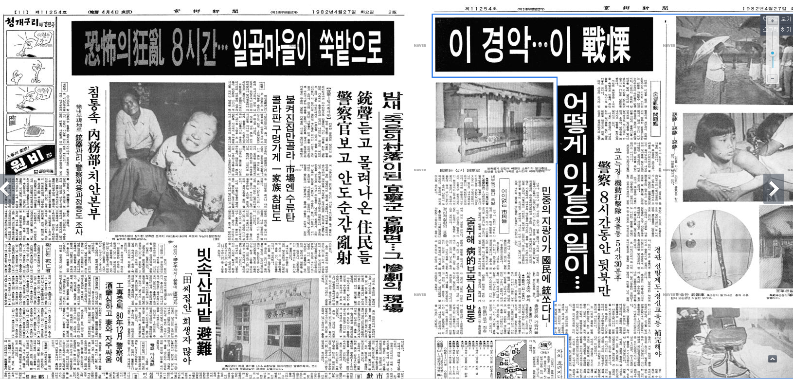 1982년 4월 26일 우범곤이 주민 62명을 총으로 쏴 죽이고, 부상자도 33명이나 발생했다. 그런데 당시 일간지를 보면, 동아, 경향, 조선일보 모두 언론 통제를 당했다. 전두환 군사정권이 언론을 통제하고 있던 상황이라서, 제목이 모두 '만취한 순경'이 벌인 사건으로만 보도하려고 했다.