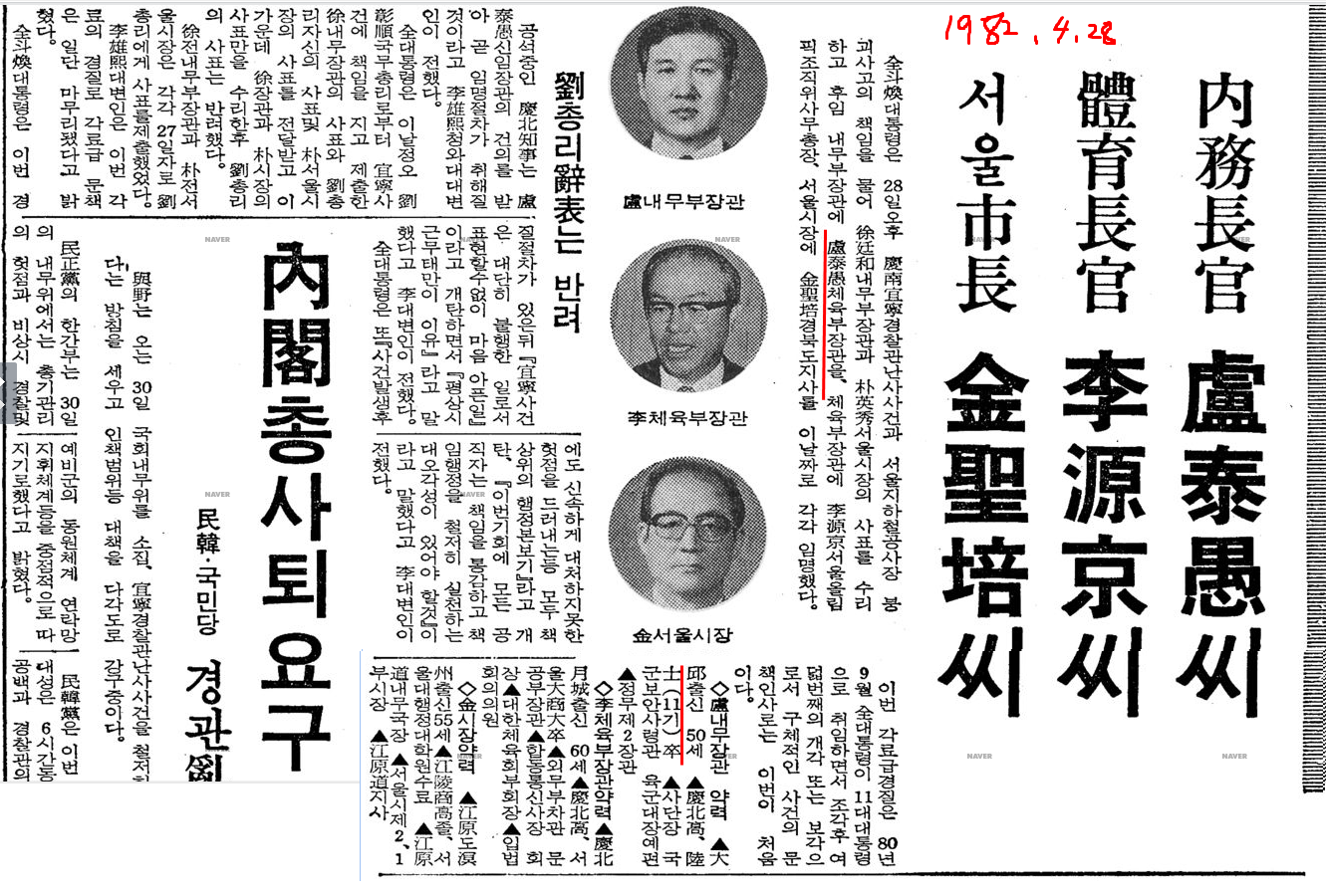 동아일보 보도. 1면. 1982년 4월 27일.