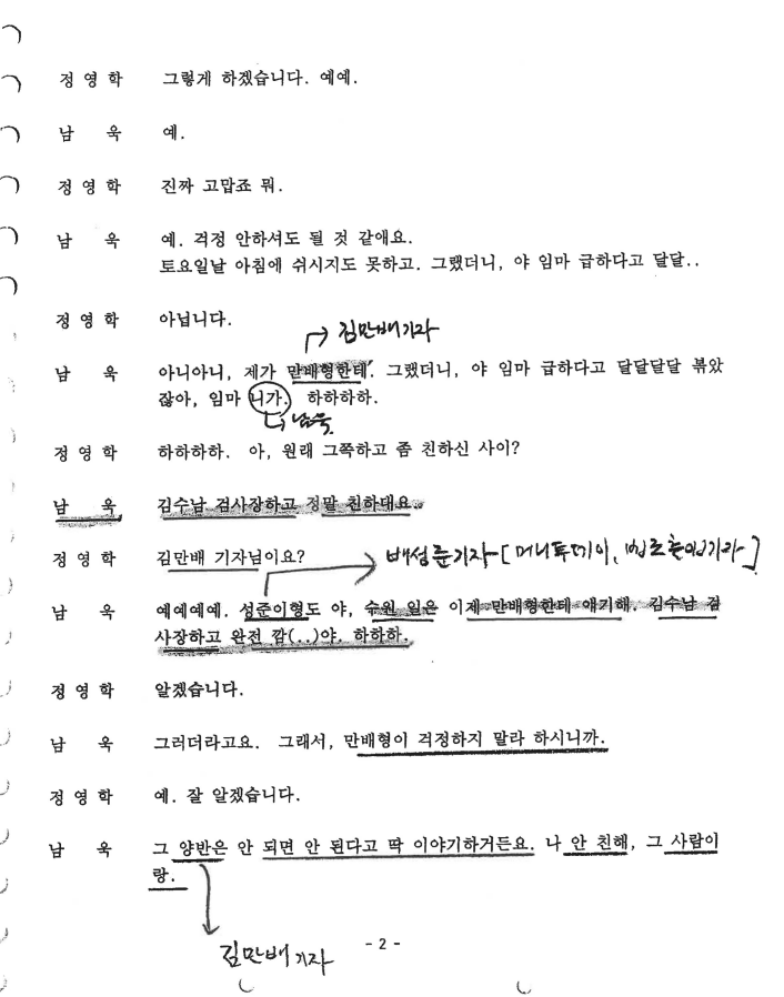 ▲정영학 녹취록(2012년 8월 18일 녹음). 정영학 녹취록에서 시점상 가장 빠른 날짜의 대화가 바로 이날이다. 김수남 수원지검장이 이 당시 대장동 업자들의 비위 사실을 알고 김만배에게 먼저 얘기를 했는데, 김만배가 '형, 내가 대장동 사업에 참여하고 있어'라면서 수사하지 말 것을 청탁한 정황이 담겨 있다. 남욱이 김만배로부터 들은 얘기를 다시 정영학에게 설명하는 상황이다. 문장에 밑줄과 손으로 적은 글자들은 정영학이 검사의 이해를 돕기 위해 직접 주석을 단 것이다.