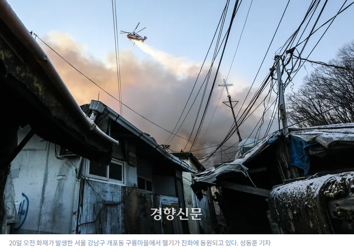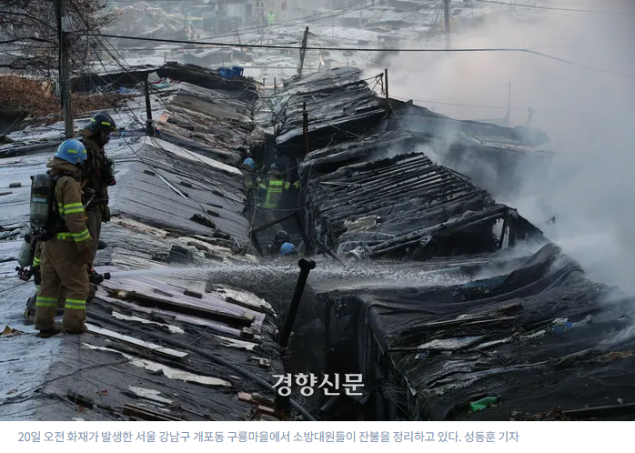 설 연휴를 하루 앞둔 이날 오전 6시27분쯤 서울 강남구 개포동 구룡마을에 큰불이 났다.