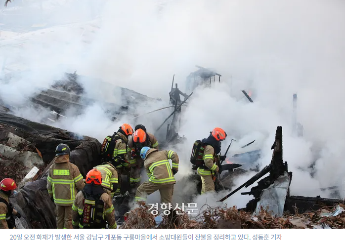 20일 오전 화재가 발생한 서울 강남구 개포동 구룡마을에서 소방대원들이 잔불을 정리하고 있다. 성동훈 기자