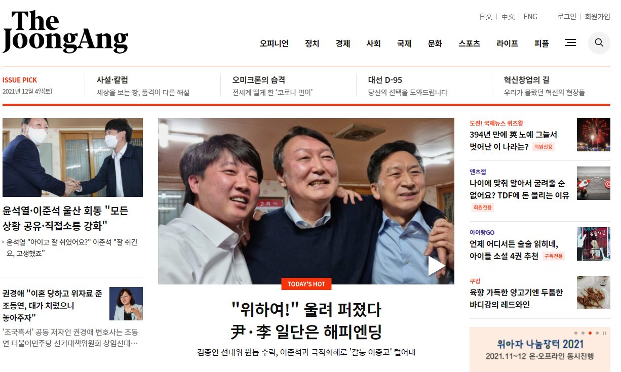 중앙일보는 '윤석열', jtbc 는 '이재명'에 분산투자한 홍석현. 뉴욕타임즈 흉내내는 줄 알았더니, 그건 아닌 것 같고. WP도 아니고.