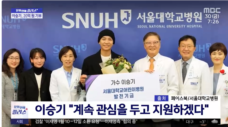 가수 겸 배우 이승기가 서울대어린이병원에 20억 원을 기부했습니다.