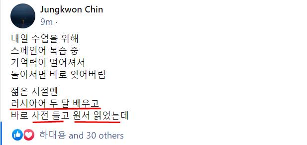 January 21, 2022 ·나이가 들어 '기억력'은 떨어져도 '정의감'은 떨어지면 안된다. 사람들이 '언어 천재', 7개국어 어쩌고 하는 건, 대부분 낭설이다. 말소리가 대부분 언어였고, 그것은 '삶의 양식'이기 때문에, 매일 실제 노동하면서 쓰지 않으면 언어,단어는 까먹는다.