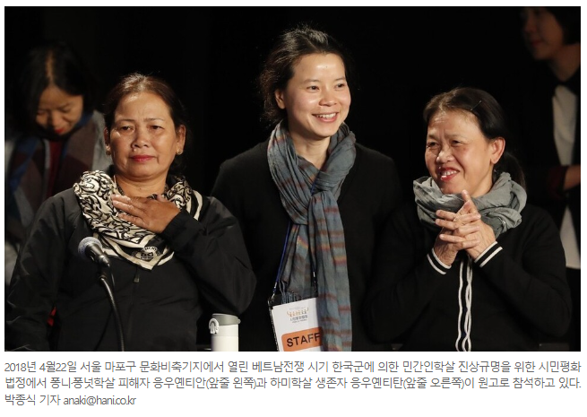 2018년 4월22일 서울 마포구 문화비축기지에서 열린 베트남전쟁 시기 한국군에 의한 민간인학살 진상규명을 위한 시민평화법정에서 퐁니·퐁넛학살 피해자 응우옌티안(앞줄 왼쪽)과 하미학살 생존자 응우옌티탄(앞줄 오른쪽)이 원고로 참석하고 있다. 박종식 기자 anaki@hani.co.kr