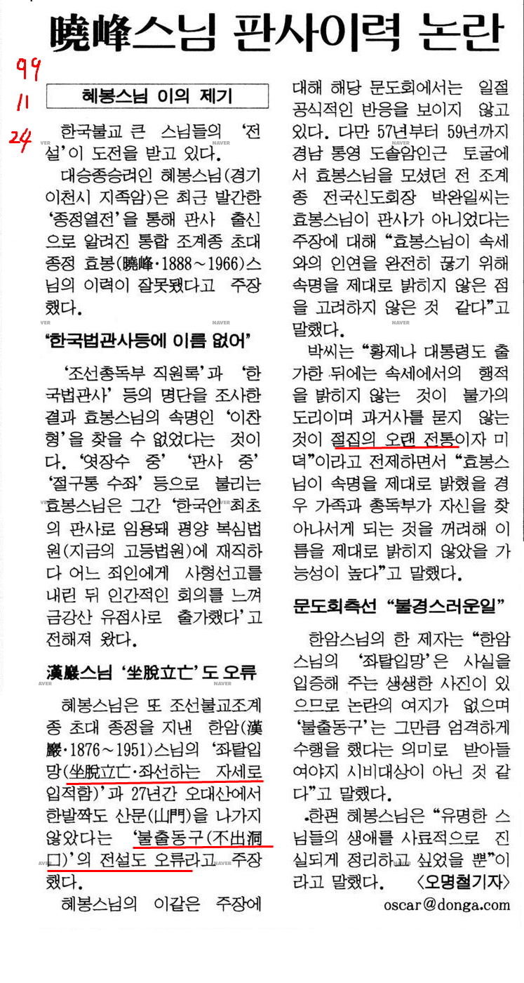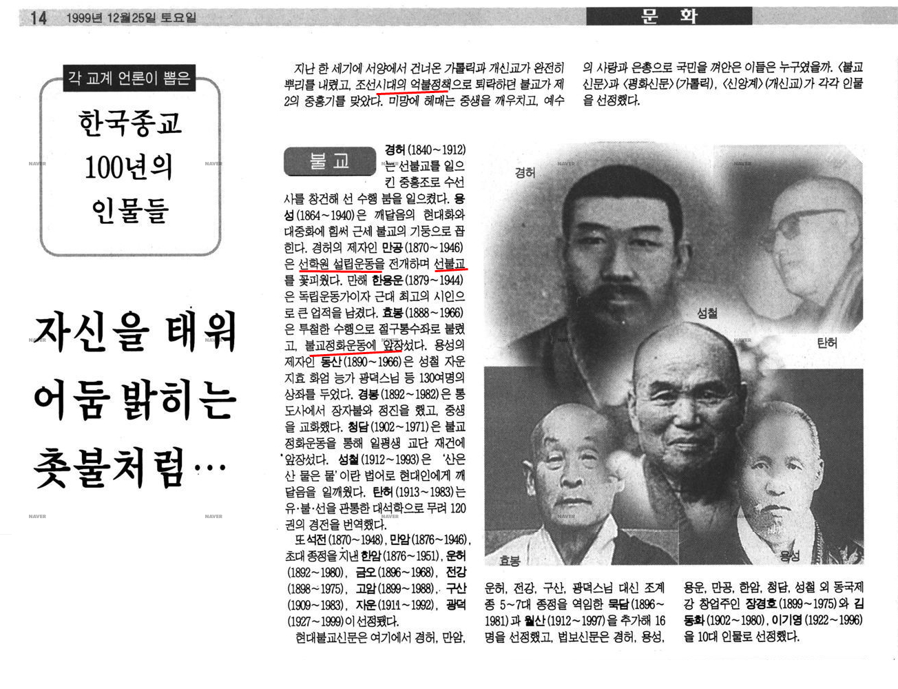 언론보도 . 효봉 스님. 한국 선불교 계보. 한겨레 신문. 1999년. 12.25