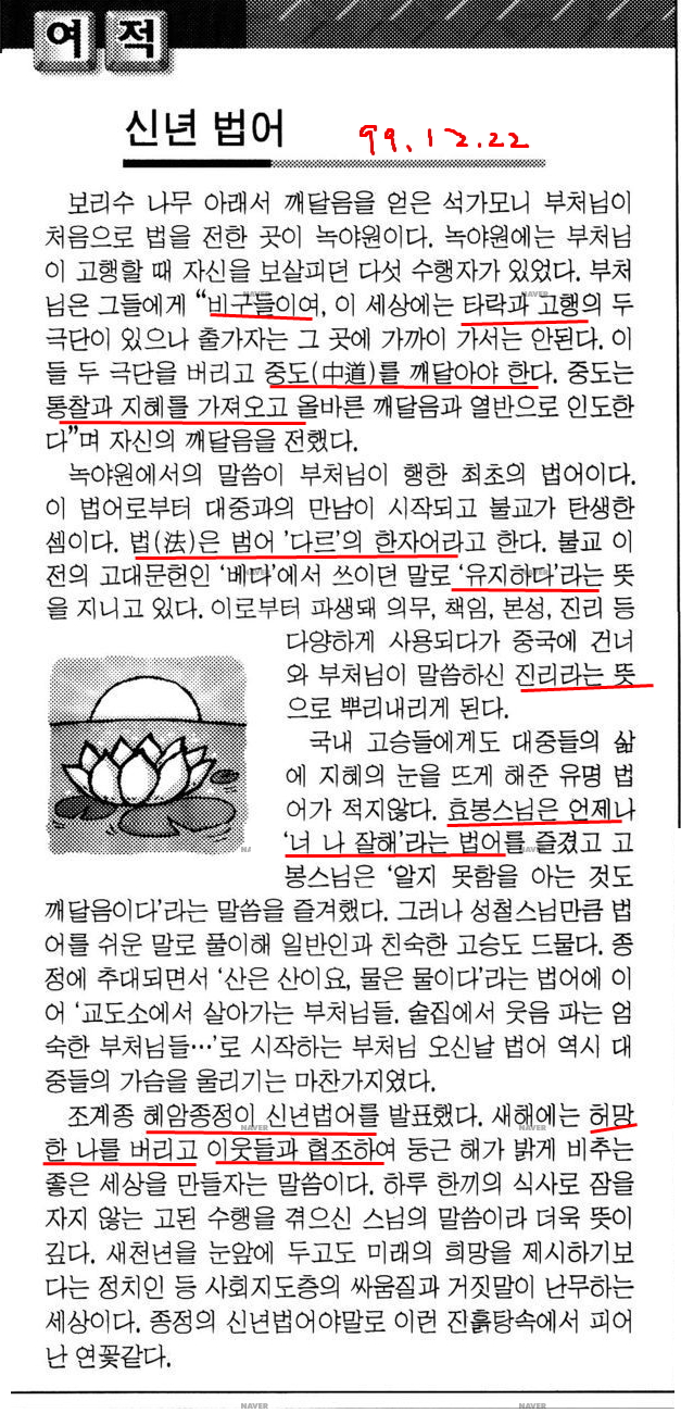 1999년 12월 22일 경향 신문. 효봉 스님의 법어 "너나 잘 해" 의 문제점.