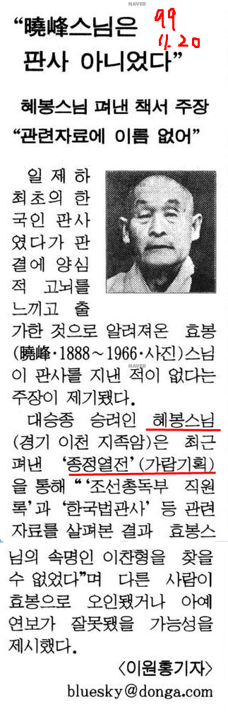 그러나 혜봉 스님에 따르면 ‘조선총독부 직원록’ 등 관련문헌을 훑어봤지만 효봉(속명 이찬형) 스님이 판사였다는 기록은 어디에도 찾을 수 없었다는 것이다.