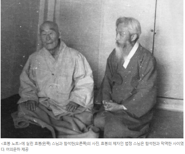 이 책엔 효봉과 사상가 함석헌이 함께 찍은 사진이 실려 있다. 법정은 1970년 함석헌이 창간한 <씨알의 소리>에 송건호(<한겨레> 초대 사장) 등과 함께 편집위원으로 참여했다.