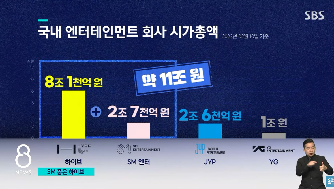 시가총액 8조 1천억 원의 하이브와 2조 7천억 원의 SM이 결합하면 몸집만 약 11조 원 규모로, 경쟁사인 JYP의 4배 수준에 달합니다.