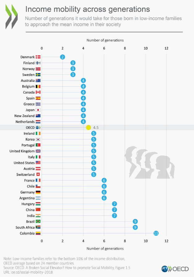 소득과 사회적 지위 이동가능성. OECD 자료. 경제적으로 최하위 10%에 속하는 사람이 그 사회의 중위 소득 집단에 도달하는 시간은? 한국은 5세대.