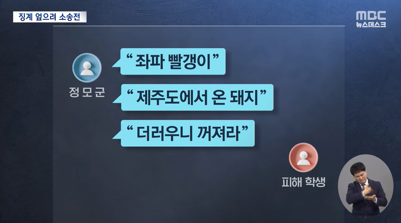 "좌파 빨갱이", "제주도에서 온 돼지"라고 놀리며 따돌리고, 피해자를 마주치면 "더러우니까 꺼지라"며 무시했습니다.